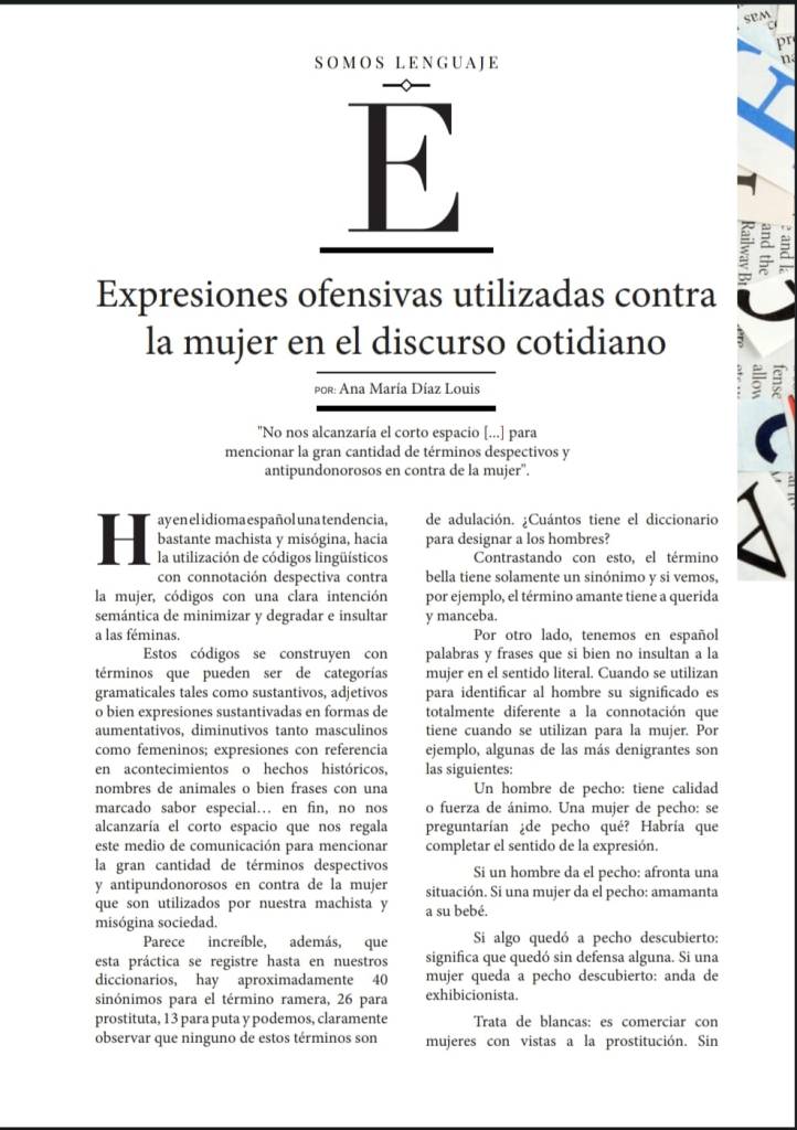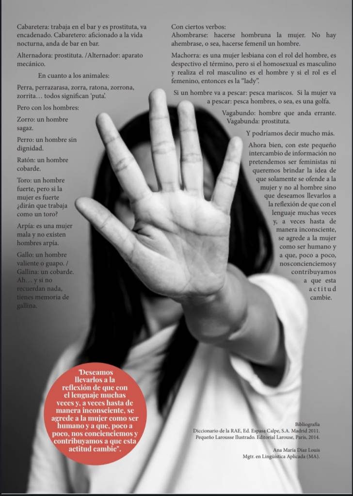 Ahora bien, con este pequeño intercambio de información no pretendemos ser feministas ni queremos brindar la idea de que solamente se ofende a la mujer y no al hombre sino que deseamos llevarlos a la reflexión de que con el lenguaje muchas veces y, a veces hasta de manera inconsciente, se agrede a la mujer como ser humano y a que, poco a poco, nos concienciemos y contribuyamos a que esta actitud cambie.