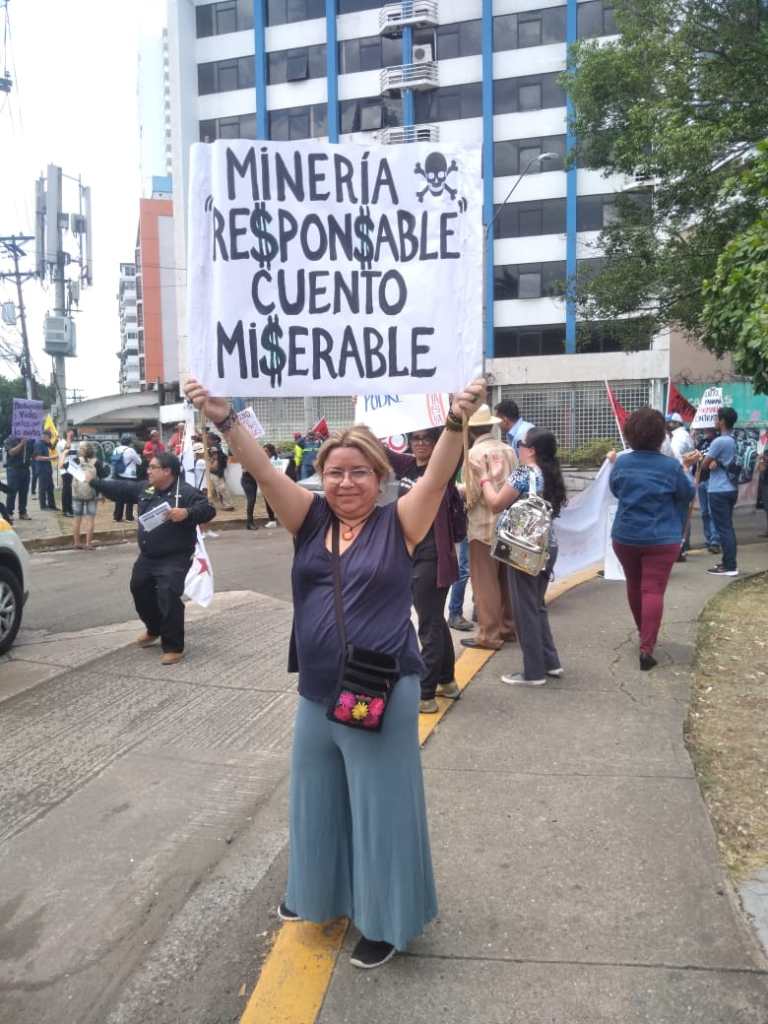 Históricamente las mujeres panameñas hemos desempeñado un rol fundamental como actoras claves en la liberación de nuestro territorio, desde el mismo inicio de la conformación de la república, de una república libre y soberana, como lo fue la gesta de independencia y la liberación de un terrible enclave como el canalero, hoy ese 50 % de la población panameña, las mujeres estamos nuevamente en la calle defendiendo el territorio, la nacionalidad, la patria, una patria mancillada, cedida, vendida a un emporio internacional minero, que no solamente lesiona nuestra soberanía nacional, sino que además ataca a la propia vida de los panameños y panameñas y que produce una de las más dramáticas lesiones a los espacios naturales, como es la minería a cielo abierto, una minería que no solamente contamina el espacio, sino que además contamina la fuente de la vida propia, el AGUA, las fuentes hídricas y la alteración de todos los ecosistemas allí presentes. Lo que en su momento fueron miles de hectáreas llenas de armonía y de verdor, hoy están convertidas en un cementerio, en una tumba de sedimentos tóxicos, venenosos y cancerígenos que ponen en riesgo todas las formas de vida allí presentes y por supuesto la vida humana.
